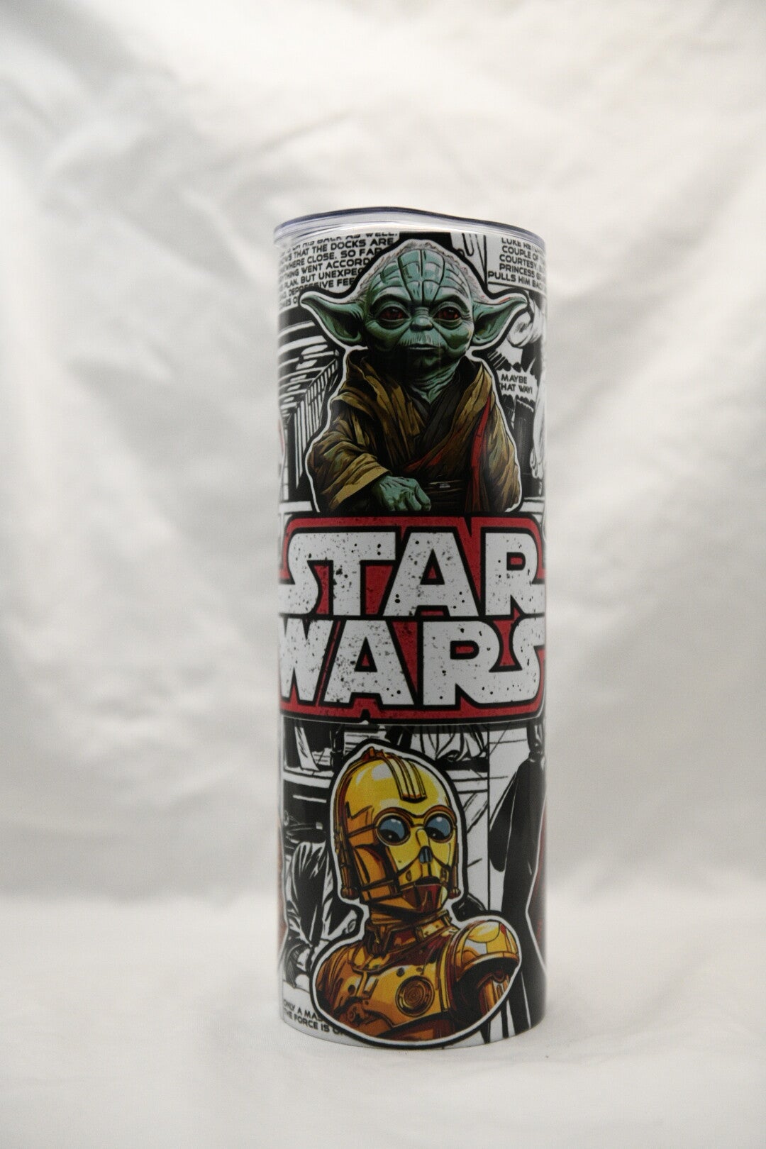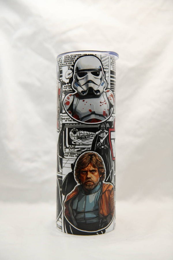 This 20oz skinny tumbler brings together iconic space-inspired characters in a bold, comic-style design that stands out anywhere you take it. It’s the kind of cup that sparks conversation and shows off your fandom without saying a word.